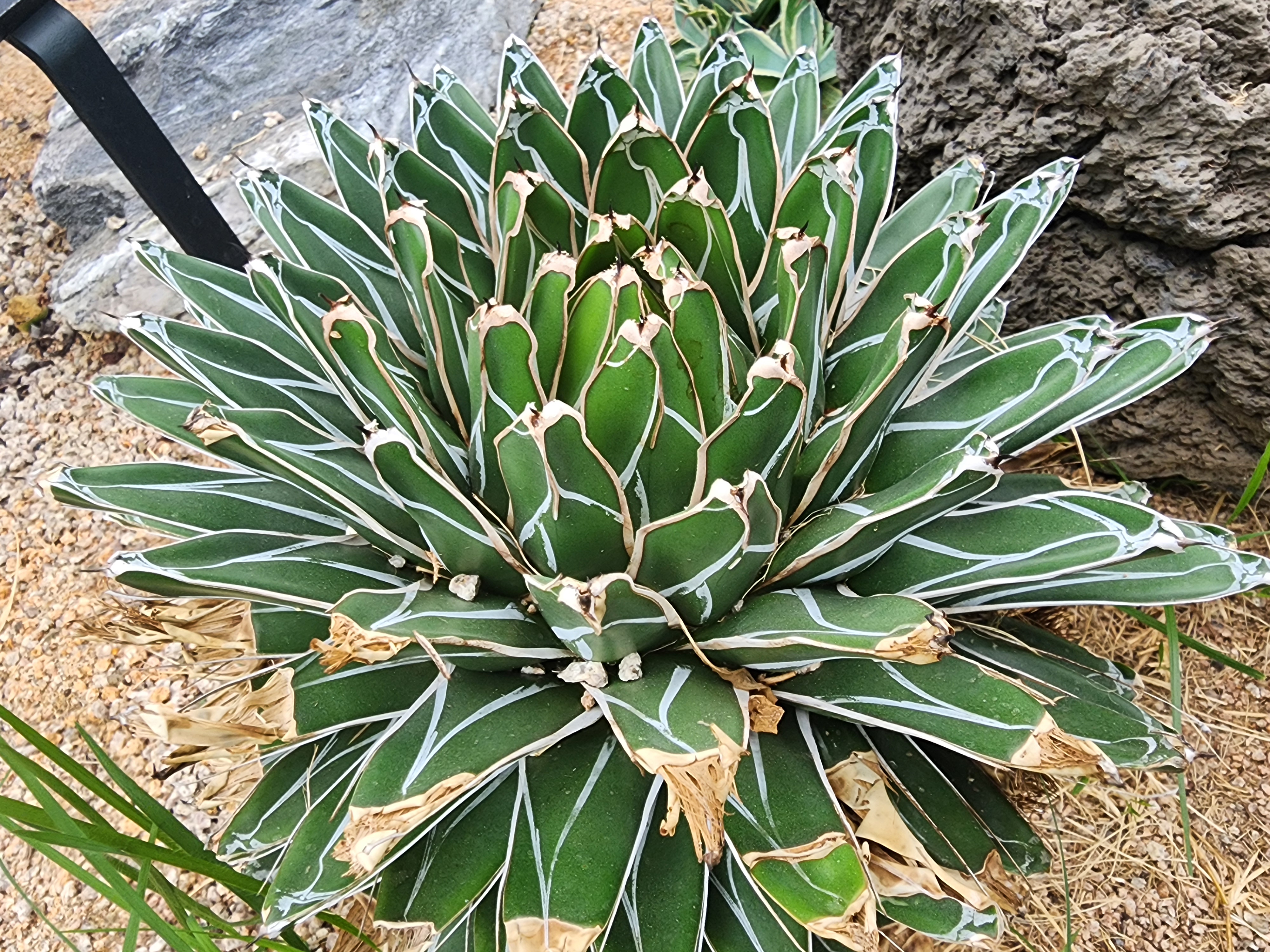 Agave victoriae-reginae, the Queen Victoria agave or royal agave, is a small species of succulent flowering perennial plant, noted for its streaks of white on sculptured geometrical leaves, and popular as an ornamental.